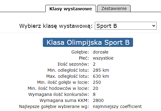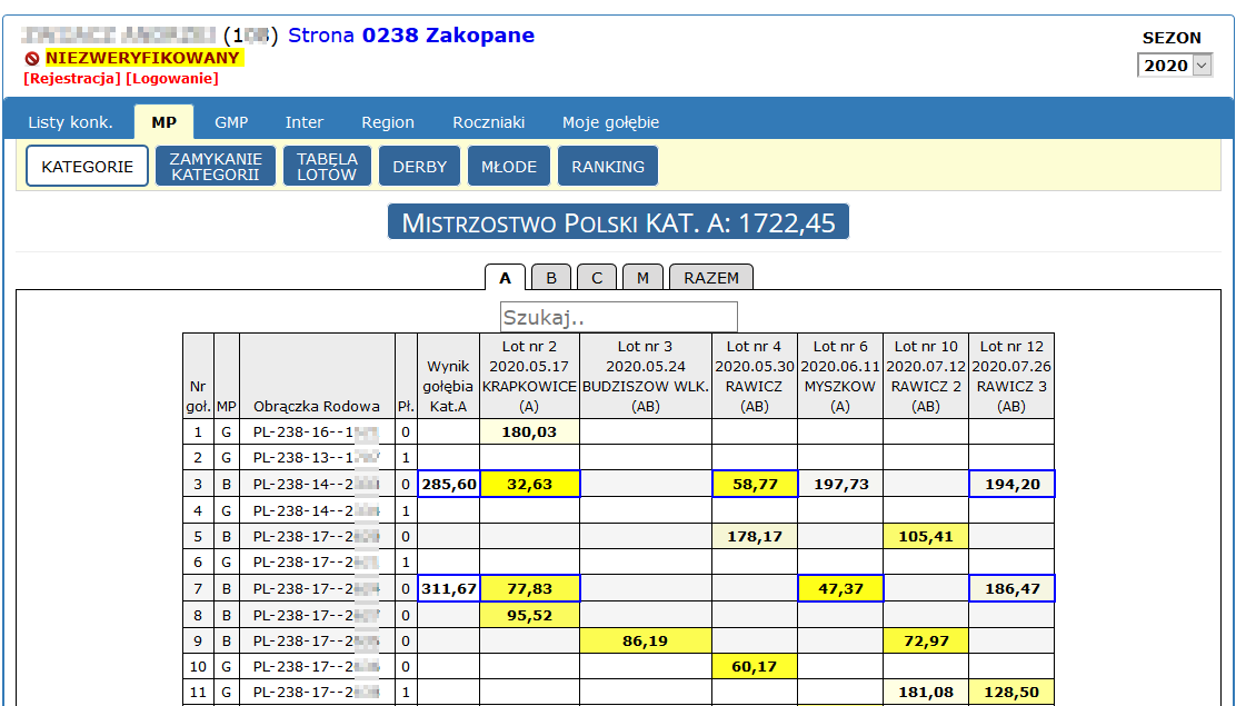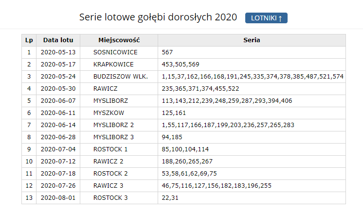 wyników lotowych dla wszystkich swoich gołębi, aktualizowanych bezpośrednio po każdym locie.
