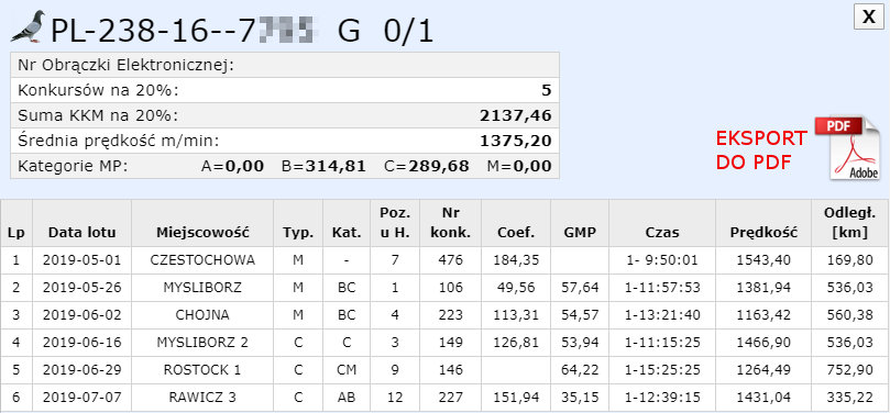 Można również analizować wyniki pojedynczego gołębia oraz planować możliwości lotowe na kolejne loty.